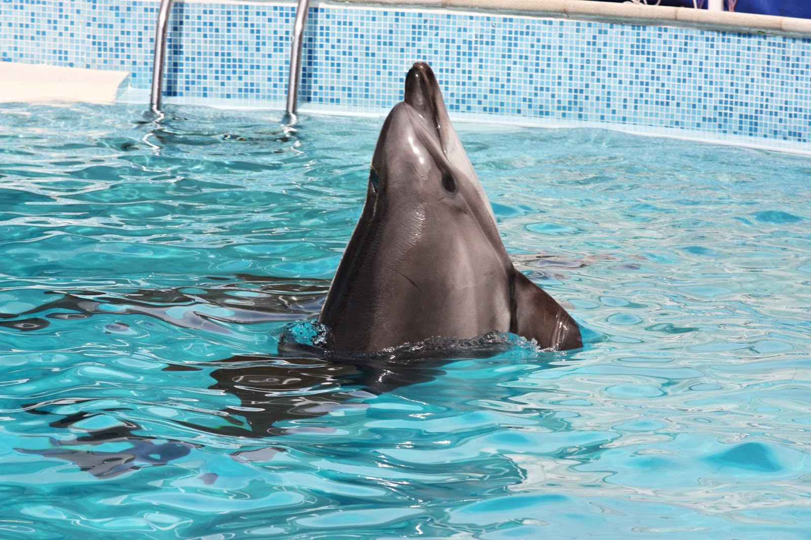 Есть даже совсем маленький дельфиненок, который конечно же не выступает, а просто плавает в бассейне и ждет старших собратьев. Я все время удивлялась, как же эти млекопитающие умеют хорошо управлять свои немаленьким телом. Ведь, совершая такие прыжки, они не задевают малыша, который все время плавает внизу от бортика к бортику.